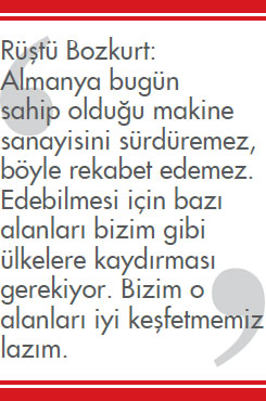 Almanya 260 milyar dolarla peşlerinde, ABD ise 205 milyar dolarla. Çin en büyük pazar, en büyük ihracatçı,en büyük imalatçı. Öyle ki, ürettiği makinelerin sadece yüzde 15’ini ihraç ederek bu noktaya ulaştılar. Bu büyük pazar, üretim bakımından fevkalade önemli dinamikler sunduğu için, bir yatırım odağı haline geldi ve ihraç ettiği malların çoğu Avrupa ve ABD markalıdır. Almanya, ürettiği makinelerin yüzde 60’ını ihraç ediyor; bizde bu oran yüzde 40 kadardır. Alman makine imalatçısı, 59 bin dolara işçi çalıştırıyor,biz 11 bin dolara. Bir Alman işçisi 135 bin dolarlık makine ihraç ediyor, bir Türk işçisi 61 bin dolarlık. Alman makinelerinin kilosu 30 dolara satılıyor, bizimkiler 10 dolara. Demek istediğim, Almanya’da daha pahalı makineler; teknolojisi daha yüksek makineler üretiliyor. Öyle de olmak zorunda; yani ancak bilgiye sahipseniz Almanya’da yeni yatırım yapabilirsiniz.