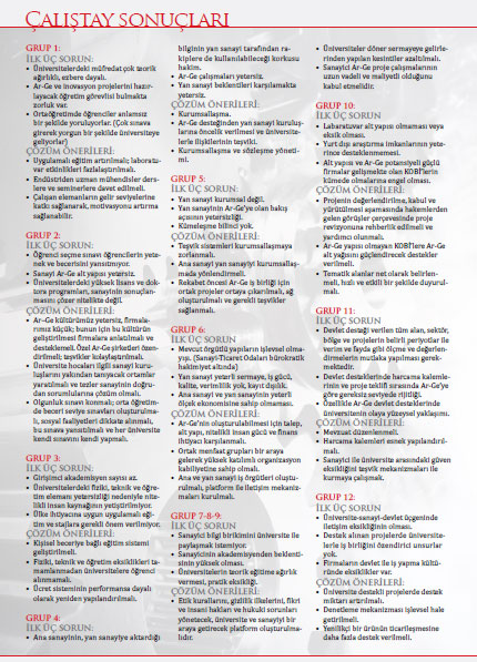 Konuşma ve sunumların ardından ilgili gruplar oluşturularak çalıştay yapıldı. Çalıştay’ı TÜSSİDE değerlendirdi Çalışma programı, TÜSSİDE’nin yürütücülüğünde akademisyenler, STK ve özel sektör temsilcilerinin katılımı ile gerçekleştirildi. 78 kişinin katıldığı çalıştayda öncelikle sorunlar tespit edildi. Önceliklendirme ve sorunlara ilişkin çözüm önerilerinin alınmasının ardından sınıflandırma yapıldı. Yaratıcı fikir oluşturma yöntem ve teknikleri kullanılarak yapılandırılan çalıştayda, tüm katılımcılar çalışmalara başından sonuna kadar aktif olarak katılarak yazılı bilgi ve belge üretti. Sorunlar tespit edildi Çalışma programının ilk bölümünde “Nitelikli İnsan Kaynağı İhtiyacının Karşılanması”, “Ana Sanayi ve Yan Sanayi İşbirliği ve Kümelenme Modelleri”, “Teknoloji Geliştirme Alanında Üniversite-Sanayi İşbirliği İmkanları” ve “Teknoloji Geliştirmede Devletin Rolü ve Desteği” başlıklarında mevcut sorunlar gruplar halinde değerlendirildi.