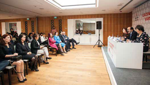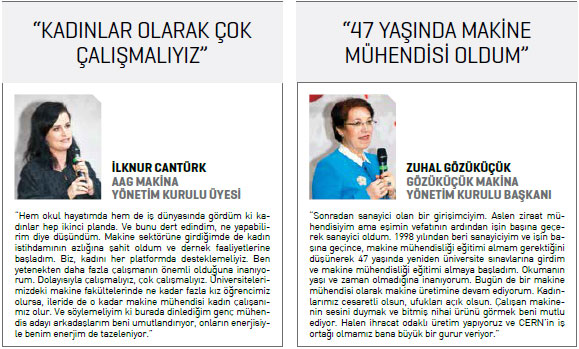 Toplantıyı takip eden Türkiye’nin başarılı kadın girişimcileri ise kısa sunumlarında, kadın girişimciliğinin ve kadın çalışan sayısını artırmanın önemini vurguladı. Gedik Holding Yönetim Kurulu Başkanı Hülya Gedik, “En çok pişmanlık duyduğum konu mühendis olmamaktır. Mühendis kızlara bayılıyorum. Çok analitik düşünüyorlar. Mühendislik, sadece mesleki olarak değil, normal hayatta da çok farklı bakışla olaylara bakılmasını sağlıyor. Ben, iş aşkıyla dolu ve hırslı bir babanın kızıyım: Cumartesi günü doğum yaptım, babam bana ‘Aferin Hülya, cumartesi doğum yaptın, pazartesi iş başı!’ dedi. Herkese şaka gibi geldi ama pazartesi iş başı yaptım. Bunu da severek yaptım” derken, Gözüküçük Makina Yönetim Kurulu Başkanı Zuhal Gözüküçük ziraat mühendisi iken nasıl makine sanayicisi olduğunun hikâyesini dinleyicilerle paylaştı. Ayhan Metal Genel Müdürü Aynur Ayhan ise “Kadınların üretimde yer alması önemli ama daha da önemli olan kadınların STK’larda görev almasıdır. Ancak böylece sektördeki sorunlara çözüm geliştirebilirsiniz” değerlendirmesinde bulundu.