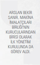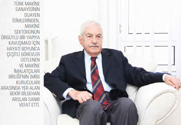 En nihayetinde hızla büyüyen Türk makine pazarı MİB’in de katkısıyla yabancı ülkelerin dikkatini çekmeye başlar. Artık yabancı kuruluşlar Türkiye’nin hem makine pazarı hem de ürünleri hakkında bilgi edinmek istemektedir. Türk makine sektörünün, sivil toplum örgütleri çatısı altında bir araya gelmesinin bürokrasi ve siyaset nezdinde daha etkili sonuç almak için önemli olduğuna inanan ve sektörün gelişerek dünya ile rekabet edecek bir konuma yerleşmesi için hayatı boyunca çeşitli sorumluluklar üstlenen Arslan Bekir Sanır’ı saygıyla anıyoruz.