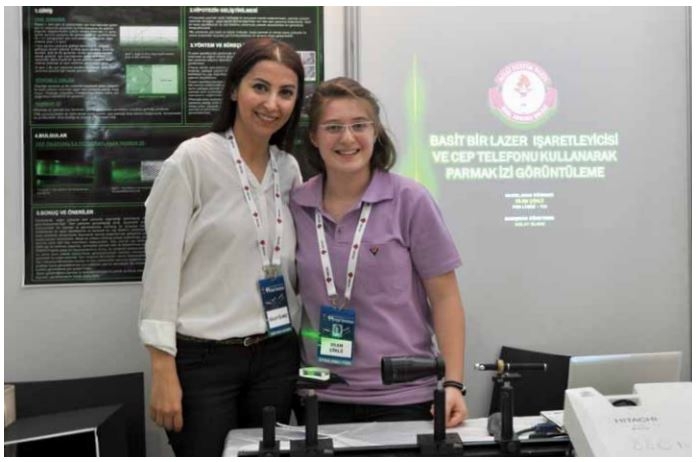 de proje üretimi konusunda ekibimizi destekledi. Bilimsel araştırma yapmaya meraklı ve yetenekli öğrencilerle çalışmak bu süreci daha da zevkli hale getirdi. Projemizde yüzeydeki parmak izinin; parmak cam yüzeyin üzerinde değilken, herhangi bir kimyasal madde kullanılmadan, ışığın temel davranışlarından biri olan tam yansımayı kullanarak, basit bir lazer işaretleyicisi ve cep telefonu yardımıyla yüksek çözünürlükte bir görüntüsünü fotoğraflamayı amaçladık. İlk olarak parmak izini cam yüzeye bıraktık. Lazer işaretleyicisinden çıkan lazer ışınını önce ikili mercek sisteminden geçirerek, yaklaşık parmak izi boyutuna ulaştırdık. Daha sonra genişletilmiş lazer ışınının parmak izinin bırakıldığı noktada tam yansıma yapmasını sağladık. Parmak izinin bulunduğu yüzeyde, ışının tam yansıma yaptığı pozisyonda yüzeydeki pürüzden dolayı tam yansıma şartının bozulması parmak izini görünür hale getirdi. Bunun sonucunda çalışmada amaçlandığı gibi; biyometrik sistemlerde kullanılabilecek, yüksek çözünürlüklü bir parmak izi görüntüsü-nü, kameralı bir cep telefonu yardımıyla görüntüleyebildik.