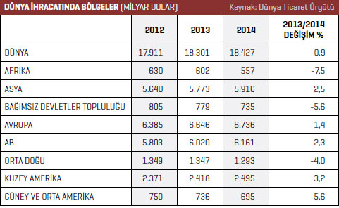 Dünya mal ihracatında oluşan küresel ekonomik ve ticari eğilimlere bağlı olarak 2014 yılında bölgesel gelişmelerde yaşandı. 2014 yılında Avrupa ve Avrupa Birliği en yüksek ihracat yapan bölge olmayı sürdürdü. Buna ilave olarak Avrupa Birliği ve daha geniş olarak Avrupa’nın ihracatı 2014 yılında yüzde 2,3 ve yüzde 1,4 büyüdü. Asya bölgesi ikinci büyük ihracatçı bölge olarak 2014 yılında ihracatını yüzde 2,5 artırarak 5.92 trilyon dolara taşıdı. Kuzey Amerika bölgesi 2014 yılında ihracatını yüzde 3,2 ile en hızlı artıran bölgedir. 2014 yılında dört bölgenin ise ihracatları azaldı. Bu bölgelerin ortak özelliği ağırlıklı olarak gelişen ülkeler ile enerji ve emtia ihracatçısı ülkelere sahip olmalarıdır. Bağımsız Devletler Topluluğunun mal ihracatı 2014 yılında yüzde 5,6, Güney ve Orta Amerika bölgesinin yüzde 5,6, Ortadoğu bölgesinin yüzde 4,0 ve Afrika bölgesinin yüzde 7,5 azaldı. Petrol ve emtia fiyatlarındaki düşüşler ihracattaki gerilemede etkili oldu.