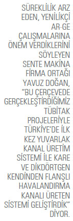Yavuz Doğan, Selahattin Gökhan ve Lütfü Kırantay tarafından 1994 yılında İstanbul’da kurulan Sente Makina, 10 yılı aşkın bir süredir kare kanal ve kapatma makinesiyle havalandırma kanal makineleri alanında imalat gerçekleştiriyor. Plazma kesim makinesinin yanı sıra dikdörtgen ve yuvarlak kanal kesim makinelerinin de üretimini yapan firma bugün itibarıyla ürünlerinin yüzde 60’ını başta Avrupa ve Orta Doğu ülkeleri olmak üzere Rusya, Kuzey Afrika, Tunus, Libya, Cezayir, Fas gibi birçok pazara ihraç ediyor. Bugüne kadar toplam 470 farklı firmaya ürünlerinin satışını gerçekleştiren Sente Makina’nın 2015 yılı değerlendirme raporları ise firmanın 2 bin 370 adet makineyi ihracat ettiğini gösteriyor.