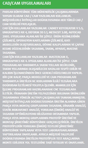 İstanbul, Pendik’te 1968 yılında kurulup, 1971 yılında işletmeye alınan Parsan, 64 bin metrekare açık, 26 bin metrekare kapalı toplam 91 bin metrekare alanda faaliyet gösteren kalıphane, dövmehane, ısıl işlem ve özel talaşlı imalat tesislerini de kapsayan entegre bir çelik dövme ve işleme fabrikasıdır. Firmanın İş Geliştirme ve Uluslararası Pazarlama Müdürü Orhan Metin, “Arka aks milleri, ön dingil ve montajlı ön dingil, akson, kol, muylu taslağı, muhtelif dişli taslakları, kardan şaftı, istavroz, kayıcı mil ve flanş taslakları, diğer otomotiv ürünleri üreten fabrikada otomotiv sanayi ürünlerinin payı yüzde 70’dir” diyor. Firmanın diğer ürünleri ise savunma sanayi, rüzgar enerjisi dişli kutuları üretimi ve madencilik gibi alanlarda pazar bulmaktadır.4 KITAYA İHRACAT