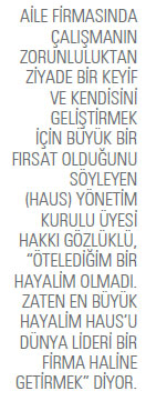 Bence bu noktada önemli olan; kişinin çalıştığı firmayla sahip olduğu kültür uyumlu mu, firmanın misyon ve vizyonunda kişi kendinden bir şeyler bulabiliyor mu? Aynı zamanda şirket değerleri kişinin kendisine uyuyor mu? Siz de bu sorulara verdiğiniz cevaplara göre kendinizi konumlandırıyorsunuz. Sanırım ailemin isteği, mühendis olup aynı zamanda da firmanın işlerini ilerletmemdi. Bahsettiğim gibi bu çerçevede de iş bana uydu. Bunun da büyük bir şans olduğunu düşünüyorum. Ötelediğim bir hayalim olmadı. Zaten en büyük hayalimiz HAUS’u dünya lideri bir firma haline getirmek. Tabii bu durumda sadece aileme ve özel hayatıma ayırdığım vakit azalıyor.