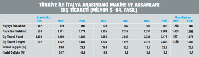 İhracatçı Birlikleri kayıtlarına göre; 2008 yılı ilk 9 ayında Türkiye’nin İtalya’ya toplam ihracatı yüzde 7 artışla 6,4 milyar dolar, OAİB iştigal alanı itibariyle makine ve aksamları ihracatı da yüzde 33,3 artışla 235 milyon dolar seviyesinde kaydedilmiş durumda. İtalya ile Türkiye arasındaki makine ve aksamları dış ticaret hacmi son yıllarda artış gösterirken, bu alandaki dış ticaret açığımız da artmaya devam ediyor. Son yedi yılda, İtalya’ya makine ihracatımız 3,5 kat artarken, İtalya’dan makine ithalatı mızın 3 kat artış gösterdiği kaydediliyor. Yine son yedi yılda, en fazla ihracat artışının 2004 yılında, en fazla ithalat artı şının da 2003 yılında yaşandığı gözlemleniyor.