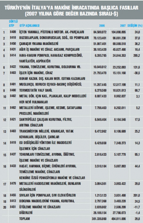 TÜİK verilerine göre 2007 yılında Türkiye’nin İtalya’ya OAİB iştigal alanı itibariyle makine ve aksamları ihracatı ince-   lendiğinde, ihracatımızın bir önceki yıla kıyasla yüzde 19,2 artarak 228 milyon dolar olarak gerçekleştiği görülüyor. İtalya, Türkiye’nin sektör ihracatından 2006 yılında yüzde 4,7 oranında pay alırken bu payın, 2007 yılına gelindiğinde yüzde 3,9’a gerilemiş olduğu görülüyor. 2007 yılı itibari ile İtalya, Türkiye’nin sektör ihracatı yaptığı 6. ülke konumunda yer alıyor.