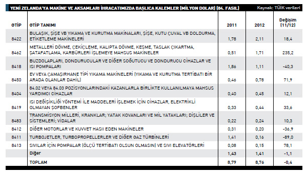 Ülkemizin Yeni Zelanda’ya gerçekleştirdiği makine ve aksamları ihracatı 2012 yılında yüzde 0,3 azalırken makine ve aksamları dış ticaret hacmi yüzde 2 artış kaydetti. 2012 yılında Türkiye’nin Yeni Zelanda’ya ihraç ettiği ürünlerin değeri 8,7 milyon dolar oldu. 84. fasılda bulaşık, şişe vb yıkama ve kurutma makineleri, şişe, kutu çuval vb. doldurma, etiketleme makineleri 2,1 milyon dolarla, en fazla ihraç edilen ürünler listenin ilk sırasında bulunuyor.