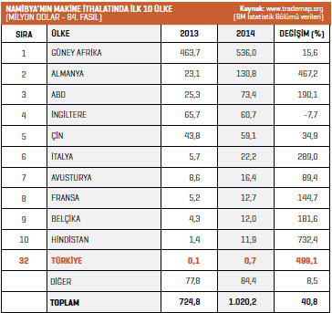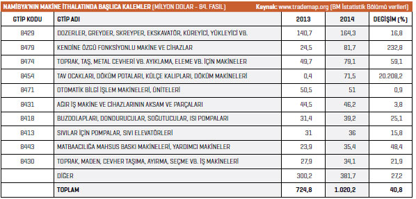 Toparlarsak, 2014 yılında Namibya, makine ithalatını yüzde 40 oranında artırarak 1 milyar dolarlık alım yaparken, bu pazarın en güçlü makine tedarikçisi ise ihracatını yüzde 15,6 artıran Güney Afrika oldu. Bununla birlikte, Namibya, 84’üncü fasılda 2014 yılı verilerine göre en fazla 8429 GTİP kodlu “Dozerler, greyder, skreyper, ekskavatör, küreyici, yükleyici” ürün grubunda ithalat yaparken, söz konusu ürün grubundaki ithalat bir önceki yıla göre yüzde 16,8’lik artışla 164,3 milyon dolara ulaşmıştı. Listenin ikinci sırasında ise 8479 GTİP kodlu “Kendine özgü fonksiyonlu makine ve cihazlar” ürün grubu bulunuyor. Namibya, 2013 yılında söz konusu kalemde 24,5 milyon dolar değerinde makine ithal ederken, bu ürün grubunda 2014’te yüzde 232,8’lik artışla 81,7 milyon dolarlık ithalat gerçekleştirdi. Namibya’nın 2014’te 84’üncü fasılda en fazla ithalat gerçekleştirdiği üçüncü kalem de 8474 GTİP kodlu “Toprak, taş, metal cevheri ayıklama, eleme için makineler” ürün grubu oldu. Söz konusu ürün grubunda 79,1 milyon dolarlık ithalat gerçekleştirilirken bu rakam 2013’te 49,7 milyon dolar seviyesindeydi.