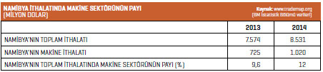 Diğer yandan, 2014 yılına ait Namibya’nın makine ithalatında ilk 10 ürün grubunun tamamında artış yaşandığı da dikkat çekiyor. Bu çerçevede en güçlü artış, ithalatını 400 bin dolardan 71 milyon 500 bin dolar seviyesine yükselten 8454 GTİP kodlu “Tav ocakları, döküm potaları, külçe kalıpları, döküm makineleri” ürün grubunda gerçekleşti. Son olarak, 2014 yılında Namibya’nın makine ithalatındaki artışın, toplam ithalat içerisindeki makine sektörü payının da yüzde 9,6’dan yüzde 12’ye yükselmesine de neden olduğunu söylemeliyiz. Bu bağlamda, Namibya’nın makine ithalatının artıyor olması, küresel pazar içinde güçlü alıcı potansiyelinin de süreceğine işaret ediyor.