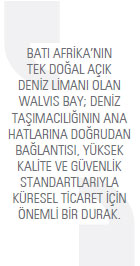 Bununla birlikte, Afrika’daki en iyi lojistik altyapılarından birine de sahip olan Namibya, lojistik üs olma kapasitesini de verimli bir şekilde kullanmaya devam ediyor. Alman sömürgesi olduğu dönemden gelişen bir demir yolu ağına sahip olan ülkede 65 bin kilometreye ulaşan bir kara yolu ağı da bulunuyor. Ayrıca Batı Afrika’nın tek doğal açık deniz limanı olan Walvis Bay Limanı, deniz taşımacılığının ana hatlarına doğrudan bağlantısı, yüksek kalite ve güvenlik standartlarıyla küresel ticaret için önemli bir durak olarak önem taşımaya devam ediyor.
