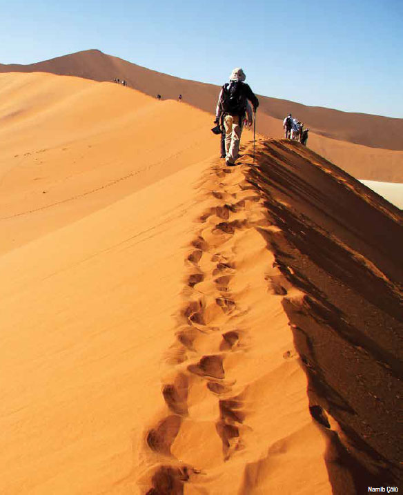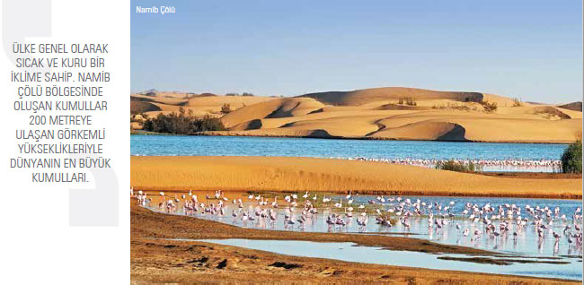 rağmen, tropik altı iklim nedeniyle son derece kurak topraklara sahip. Bölgedeki ilk yerleşimlerin MÖ 3000’e kadar uzandığı Namibya, adını, Atlantik Okyanusu kıyısında bin 600 kilometre boyunca uzanan ve 50 bin metrekarelik alana yayılan, UNESCO Dünya Mirası Listesi’ndeki Namib Çölü’nden almış. Namib kelimesi ise Nama dilinde “çok büyük” anlamına geliyor. Batısında Namib Çölü, güney ve doğusunda ise Kalahari Çölü’nün yer aldığı Namibya, dünyanın en az nüfus yoğunluğuna sahip ülkelerinden biri.