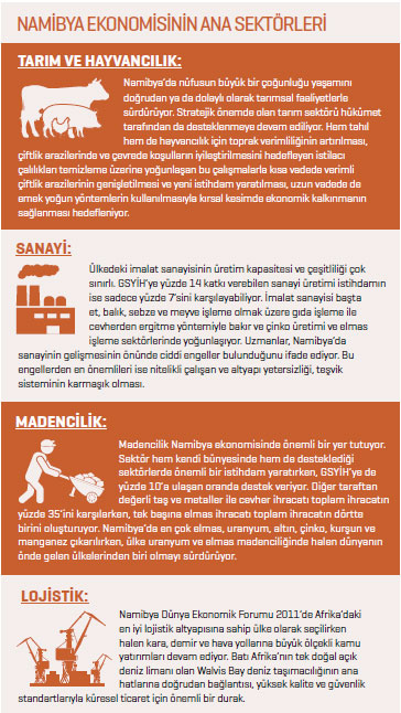 Namibya, geçmişte ırkçı politikalarına maruz bırakılmış olsa da Güney Afrika ile ayrılmaz bir ekonomik bütünlük sergiliyor. Namibya’da büyük ekonomik sektörler tarım (yüzde 5), madencilik (yüzde 10), sanayi sektörleri (yüzde 14) ve turizmken, Namibya’da gelişmiş bir bankacılık altyapısı da yer alıyor. Namibya’da nüfusun büyük bir çoğunluğu yaşamını doğrudan ya da dolaylı olarak tarımsal faaliyetlerle sürdürürken, ülke topraklarının tarıma elverişsizliği ve sınırlı sulama olanakları, sektörün potansiyelinden uzak kalmasına ve ülkenin tarım ürünleri ithalatının yükselmesine de neden oluyor. Bununla birlikte stratejik önemde olan tarım sektörü halen Namibya’da ayrıcalıklı olarak desteklenmeye devam ediliyor. Hem tahıl hem de hayvancılık için toprak verimliliğinin artırılması, çiftlik arazilerinde ve çevrede koşulların iyileştirilmesini hedefleyen istilacı çalılıkları temizleme üzerine yoğunlaşan bu çalışmalarla kısa vadede verimli çiftlik arazilerinin genişletilmesi ve yeni istihdam yaratılması, uzun vadede de emek yoğun yöntemlerin kullanılmasıyla kırsal kesimde ekonomik kalkınmanın sağlanması hedefleniyor. Ülkedeki imalat sanayisinin üretim kapasitesi ve çeşitliliği ise çok sınırlı gerçekleşiyor.