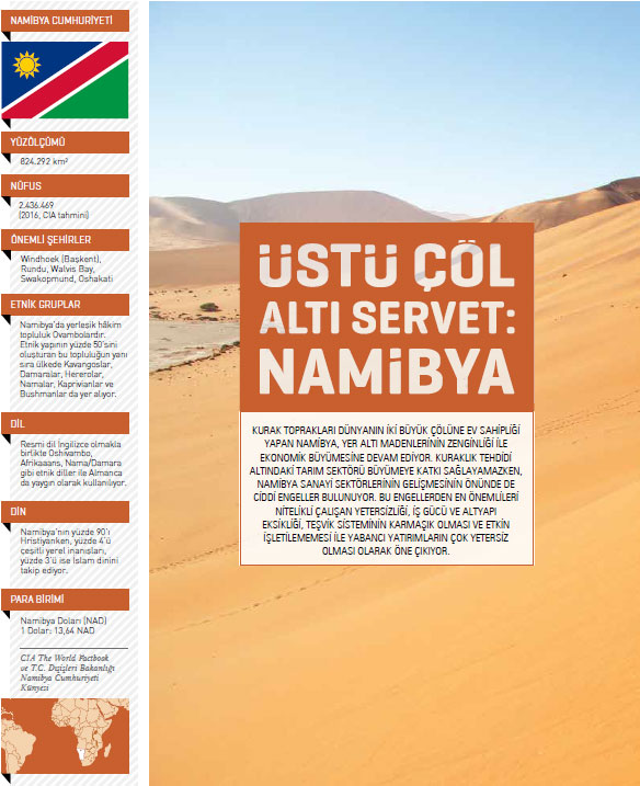 yazık ki potansiyelinden uzakta seyrediyor. TÜİK verilerine göre 2000 yılında 1,33 milyon dolar olan iki ülke arasındaki dış ticaret hacmi yıllar içinde düzenli bir yükseliş grafiği sergilese de 2010 yılında ancak 3,7 milyon dolara ulaştı. 2010’dan sonra hızlı bir gelişim gösteren dış ticaret hacmi 2015’te 85,4 milyon dolara ulaşsa da 2016 yılında 40,9 milyon dolarlık ihracat ve 804 bin dolarlık ithalatla Türkiye lehine ilerlemeye devam etti. Türkiye, Namibya’ya 2016 yılında en çok mineral yakıtlar, mineral yağlar ve bunların damıtılmasından elde edilen ürünler; inorganik kimyasallar, kıymetli metal; metal cevherleri; balıklar, kabuklu hayvanlar, suda yaşayan diğer omurgasız hayvanlar ile demir veya çelikten eşya ihraç ediyor.