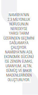 Bununla birlikte Namibya’nın 2,3 milyonluk nüfusunun neredeyse yarısı, topraklarının ancak yüzde 1’i tarıma elverişli olmasına rağmen tarım üzerinden geçimini sağlamaya çalışıyor. Diğer yandan Namibya’nın asıl ekonomik gücü ise zengin elmas, uranyum, altın, gümüş ve bakır madenlerinden oluşuyor.
