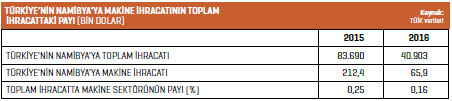 Bu bağlamda, Namibya’nın 2014 yılı makine ithalatının 2013’e göre yüzde 40,8 artarak 1 milyar dolar seviyesinin üzerine çıktığını görüyoruz. Aynı dönemde Namibya’nın makine ithal ettiği ilk beş ülke ise Güney Afrika, Almanya, ABD, İngiltere ve Çin olarak sıralanıyor. Türkiye, bu dönemde Namibya’nın makine ithalatında 32’nci sırada yer alırken, BM İstatistik Bölümü verilerine göre Türkiye’den Namibya’ya 700 bin dolara yakın değerde makine ihraç edildi. BM İstatistik Bölümü verilerinden daha güncel olan TÜİK verilerine göre ise 2015’te 212 bin dolar olan bu ihracat, 2016’da yüzde 70’e varan düşüşle 66 bin dolar seviyesine kadar geriledi.